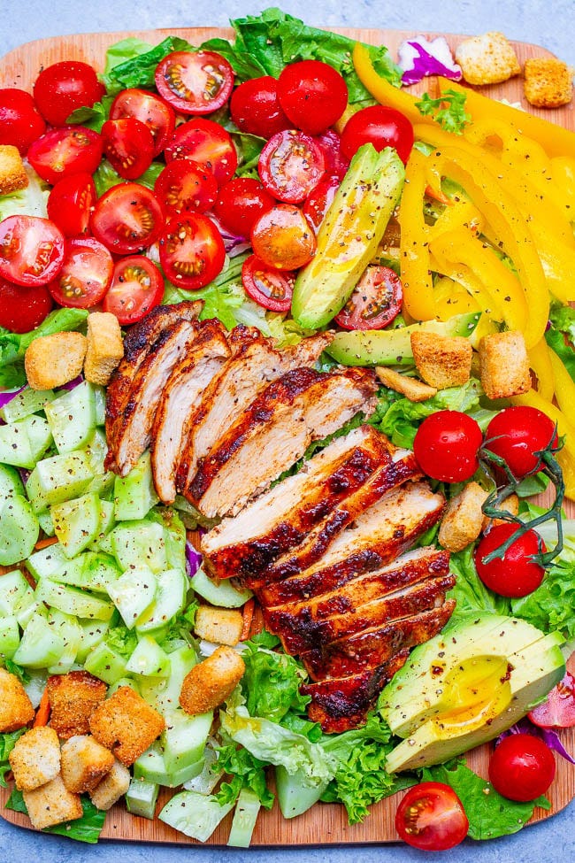 Chopped Chicken Salad 🥗 An EASY chopped salad with so much FLAVOR and CRUNCH topped with your extra juicy chicken so it’s ready in 15 minutes! Homemade honey apple cider vinaigrette adds the finishing touch!