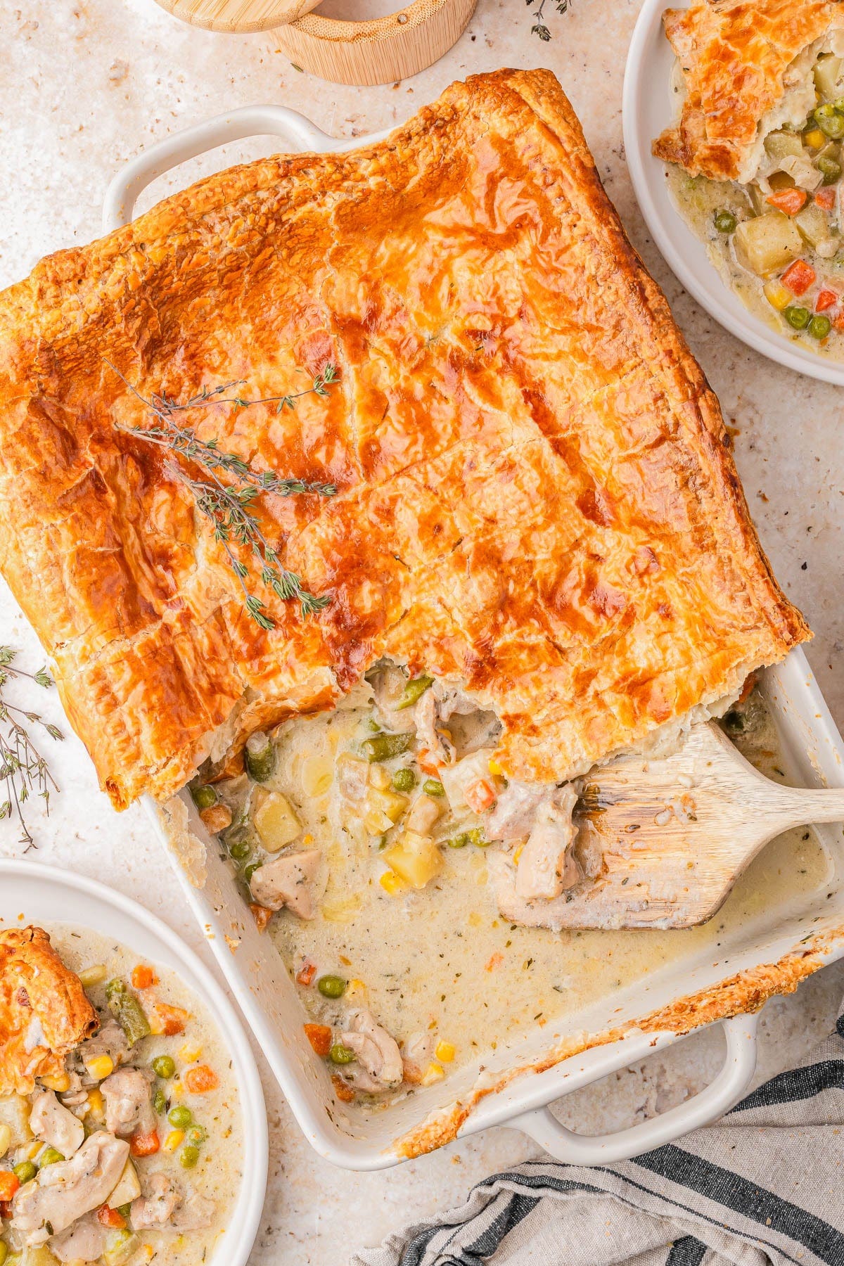 Easy 🫛🥕🥔 Chicken Pot Pie Casserole with puff pastry is a great twist on pot pie and you don’t need to make pie crust! The puff pastry bakes to golden, light and flaky perfection! The filling has big pieces of juicy chicken, carrots, peas, and potatoes in a creamy sauce that’s made from scratch. You can use rotisserie chicken or leftover chicken (or holiday turkey) to save time.