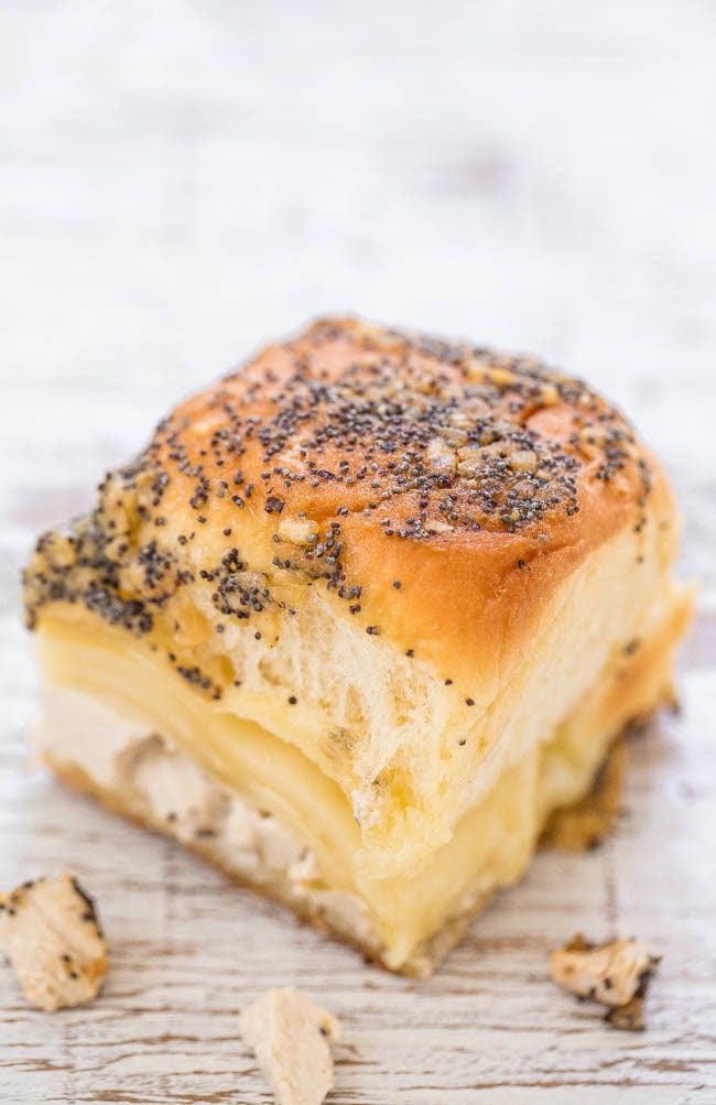 Cheesy Chicken Ranch Sliders 🍔 Tender chicken is coated in tangy ranch dressing and topped with Swiss cheese. It’s all nestled in soft, sweet Hawaiian rolls with a buttery Dijon, onion, and poppy seed topping! Make these easy sliders for game days, graduations, or easy kid-friendly (and adult-friendly) meals!