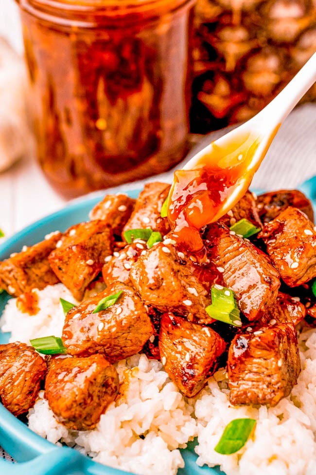 Teriyaki Steak Tips 🥩🍍😍 Tri-tip steak tip bites are cooked to perfection and then topped with a thick and sticky homemade pineapple teriyaki sauce! A family favorite that everyone will love and is FAST and EASY to make!