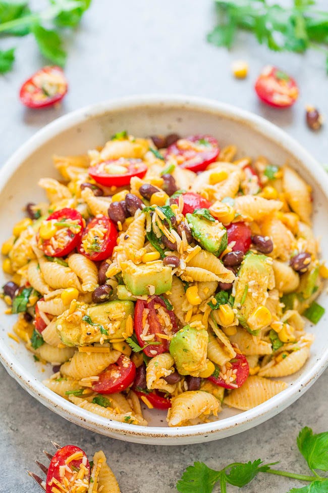 Taco Pasta Salad – EASY, ready in 20 minutes, and loaded with great Mexican-inspired ingredients including corn, black beans, tomatoes, cilantro, avocado, and more! Very kid-friendly (and adult friendly) and they’ll all want seconds!
