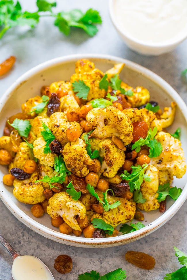 Roasted Curried Cauliflower and Chickpea Salad is an EASY, healthy, lettuce-less salad with roasted curried cauliflower and chickpeas as the STARS! Topped with raisins, pistachios, cilantro, and a DELISH tangy Greek yogurt dressing!