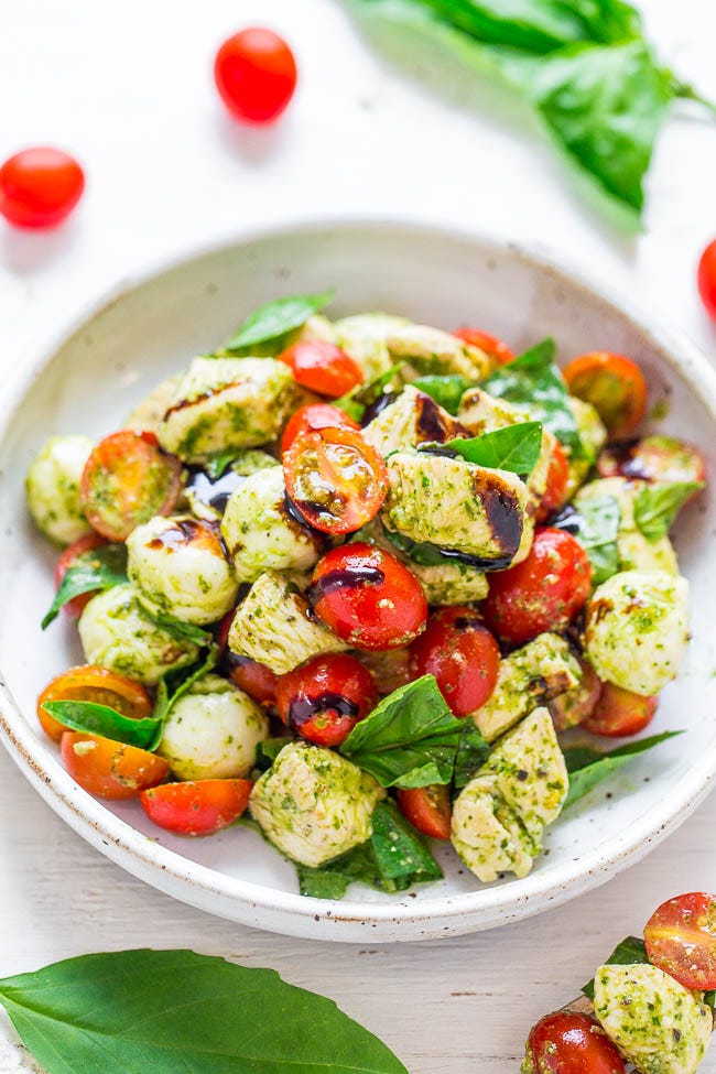 🍗🍅🌿 My Pesto Chicken Caprese Salad combines JUICY chicken, ripe tomatoes, fresh mozzarella, and a homemade pesto. A fun twist on classic Caprese, it’s easy, ready in 20 minutes, and loaded with rich basil flavor! The balsamic keeps the basil from oxidizing.