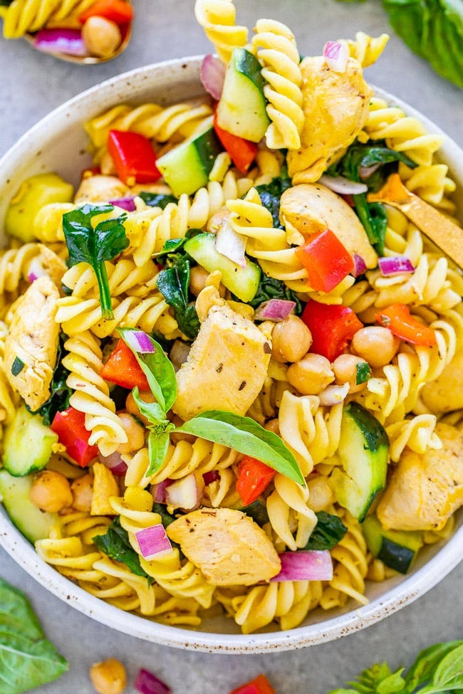 Italian Chicken Pasta Salad is easy, ready in 20 minutes, and showcases some of my favorite summer ingredients. It’s perfect for summer potlucks and BBQs, or as a no-fuss family dinner!
