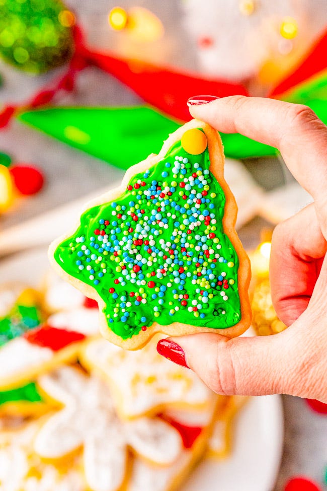 Tender, buttery holiday sugar cookies that use a no-roll dough with the sprinkles baked right in, so you don’t even have to decorate them! When you’re in a time crunch or lacking a bit of motivation, this recipe is the one to reach for!